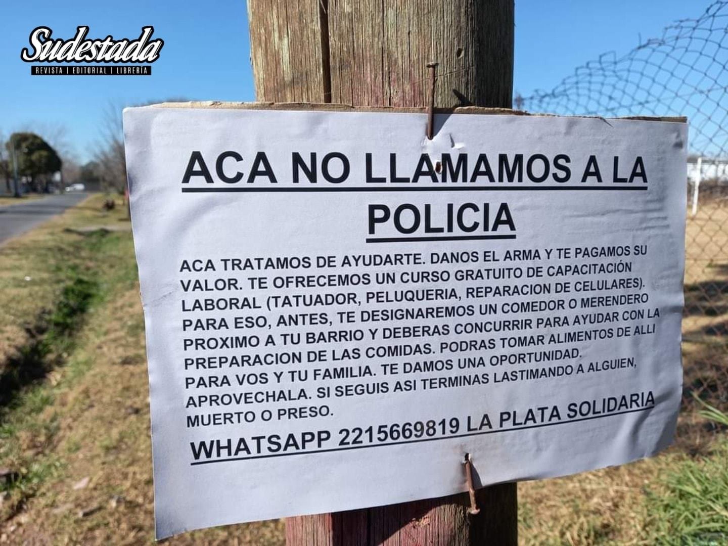 «Acá no llamamos a la policía”, dicen los carteles que un grupo de vecinos de Tolosa, La Plata, pegaron en los postes de luz y lugares visibles. La idea es dialogar y proponer una alternativa social (cursos, capacitaciones, changas, asistir a un comedor) al problema de la falta de laburo y oportunidades, el hambre y la desesperación. La propuesta es discutible, idealista tal vez, los mismos vecinos que la largaron saben que quizá no se trate de ninguna solución o siquiera de una buena idea, pero seguro confirma una certeza: hay gente que le está buscando la vuelta a la ausencia del Estado en los barrios, y no pretende que el Estado llegué sólo para meter bala y poner en peligro a todos.
