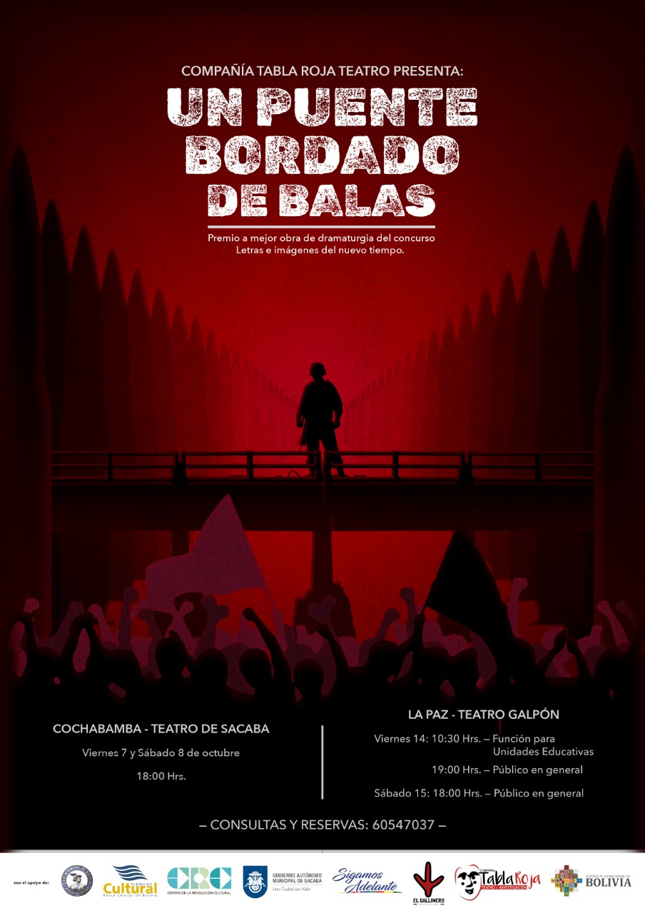 La razón del porque escribimos esta obra se debe a que tenemos un montón de material que nos habían llegado: testimonios, imágenes, también conocemos personas y compañeros/as muy cercanos/as a nosotros estuvieron ahí de testigos, con la responsabilidad inmensa de que en algún momento también hacer su aporte ya que son muchas heridas, momentos traumáticos, tiempos en los que la dignidad el dar cara por procesos que en resumen todo se vio muy expuesto lo cual nos dejó heridas muy fuertes. Entonces con ese material respondiendo a una convocatoria que invitaba a escribir entre sus varias categorías/ámbitos en los que la Fundación Cultural del Banco Central de Bolivia invitaba para que las personas dieran su palabra desde expresiones en imagen y también a través de la escritura donde estaba la dramaturgia y con Alejandro que es el compañero con quien escribimos la obra decidimos participar dado que al tener una fecha límite por fin podíamos hacer algo con este material con la esperanza de que ojalá se llegase a poner en escena pero de momento teníamos que escribirla, entonces ahí también estuvieron presentes un par de compañeros muy importantes en el proceso: Carol Ballesteros y Víctor Salvador que cada uno por su lado y también junto con Alejandro habían ido justo los días previos y posteriores a la masacre para estar ahí con las personas conversando, sintiendo y viendo esa tensión crecer y también con esas memorias contenidas en el cuerpo propio mas una cronología de los hechos cruzando todo con el material acumulado salió esta obra escrita que se llama Un Puente Bordado de Balas…dejamos el bloque completo de la entrevista con Alexia Loredo y Mayra Paz….