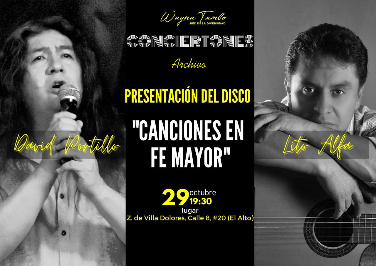 Todas y todos estamos invitados a vivir nuevamente los conciertones de la red de la diversidad y en esta oportunidad estaremos compartiendo dos temas de la presentación ¡EN VIVO! de Orlando Alfaro “Lito Alfa” y David Portillo, que, en la noche del 29 de octubre del 2021, nos hicieron parte de la presentación del disco “Canciones en Fe Mayor” disco que reúne canciones propias y una selección musical de diferentes territorios.