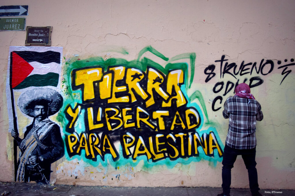 Destaca particularmente una propuesta gráfica oaxaqueña de la figura de Emiliano Zapata, con la bandera palestina y la leyenda “Tierra y Libertad” adaptada para el apoyo hacia el oriente.
