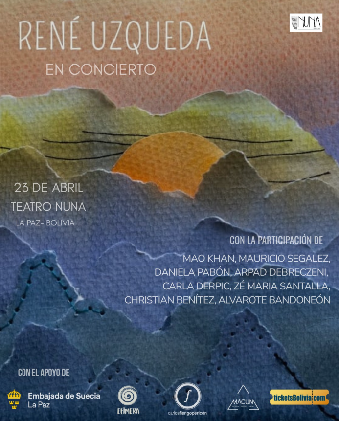 Este 23 de abril René Úzqueda presenta un nuevo disco después de 19 años. La presentación será en el Teatro Nuna de la ciudad de La Paz, junto a artistas importantes de la escena musical, como Carla Derpic, Arpad Debreczeni y Cristian Benitez.