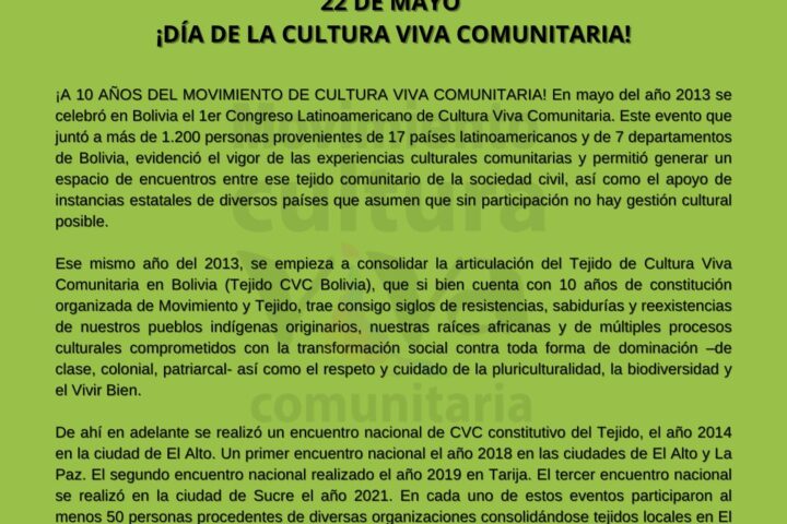 ¡A 10 AÑOS DEL MOVIMIENTO DE CULTURA VIVA COMUNITARIA! En mayo del año 2013 Se celebró en Bolivia el 1er Congreso Latinoamericano de Cultura Viva Comunitaria. Este evento que juntó a más de 1.200 personas provenientes de 17 países latinoamericanos y de 7 departamentos de Bolivia, evidenció el vigor de las experiencias culturales comunitarias y...