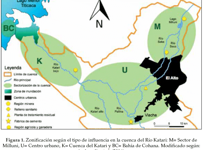 Geográficamente, el Lago Titicaca se divide en dos partes: el Lago Menor, llamado Huinaymarca (SE) y el Grande, llamado Lago Chucuito (NW). El 67% del volumen total del lago depende de los aportes de varios afluentes (Molina-Carpio et al. 2014). Estos afluentes controlan el régimen hidrológico de la región y al mismo tiempo contribuyen con la carga de nutrientes que son acarreados desde la región montañosa y a su paso también pueden ser contaminados. Este es el caso particular de la cuenca del Río Katari, cuyas aguas nacen en el nevado del Huayna Potosí y luego atraviesan la mancha urbana de El Alto, hasta llegar a la Bahía de Cohana en la región del Lago Menor.